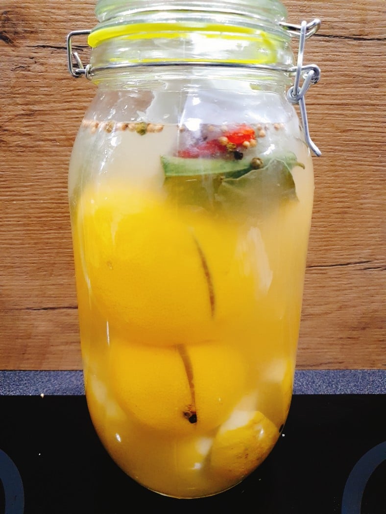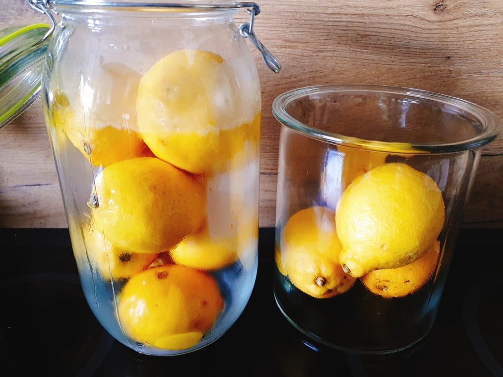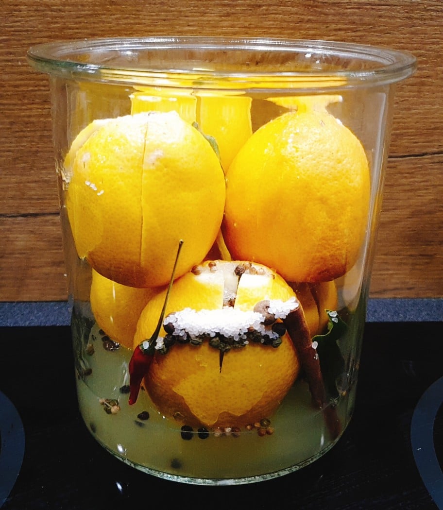 Na dno każdego słoika wlewamy sok z cytryn, wsypujemy po łyżeczce kolendry, czarnego pieprzu, 3 zioła angielskie, lasce cynamonu, papryczce piri-piri oraz 2 liście laurowe i 2 liście kaffiru (limonki) jeśli mamy. Następnie ciasno układamy nacięciem do góry nasze cytryny. Tak przygotowane słoiki ostrożnie zalewamy solanką. Solanka musi przykrywać wszystkie cytryny, najlepiej jest obciążyć powierzchnię słoika czymś co uniemożliwi wypłynięcie kiszonce na powierzchnię, np. spodek od filiżanki, wyparzony kamień.