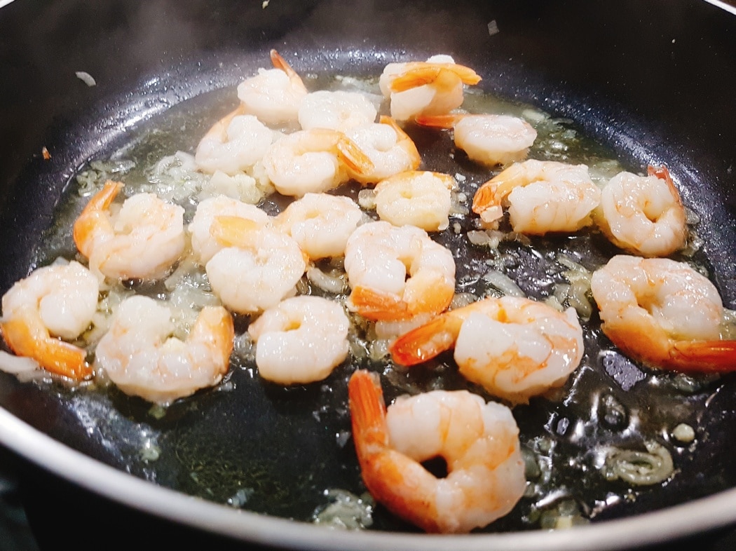 Na patelni rozgrzewamy oliwę z oliwek. Dodajemy szalotkę, a gdy się zeszkli dorzucamy czosnek. Po ok. minucie dodajemy krewetki. Krewetki smażymy aż zaczną być lekko złote.
