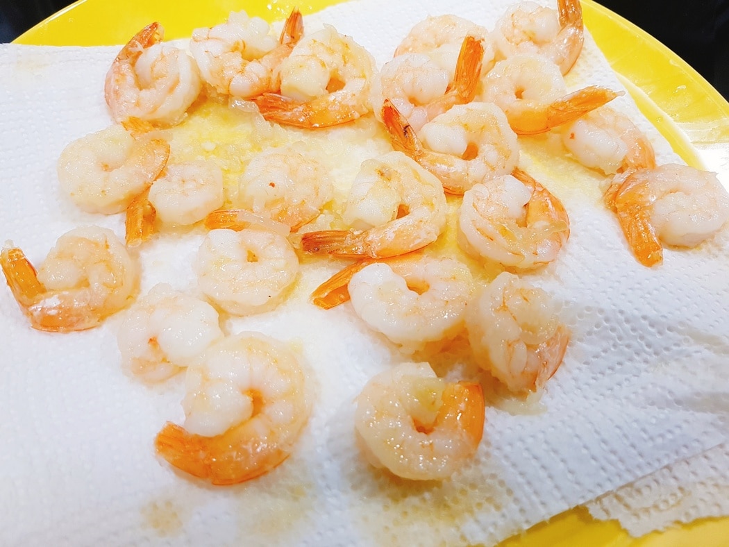 Jeżeli używamy świeżych krewetek, to obieramy je z pancerzyków i wyjmujemy jelitko, a następnie myjemy. Natomiast jeżeli masz krewetki mrożone – myjemy je.