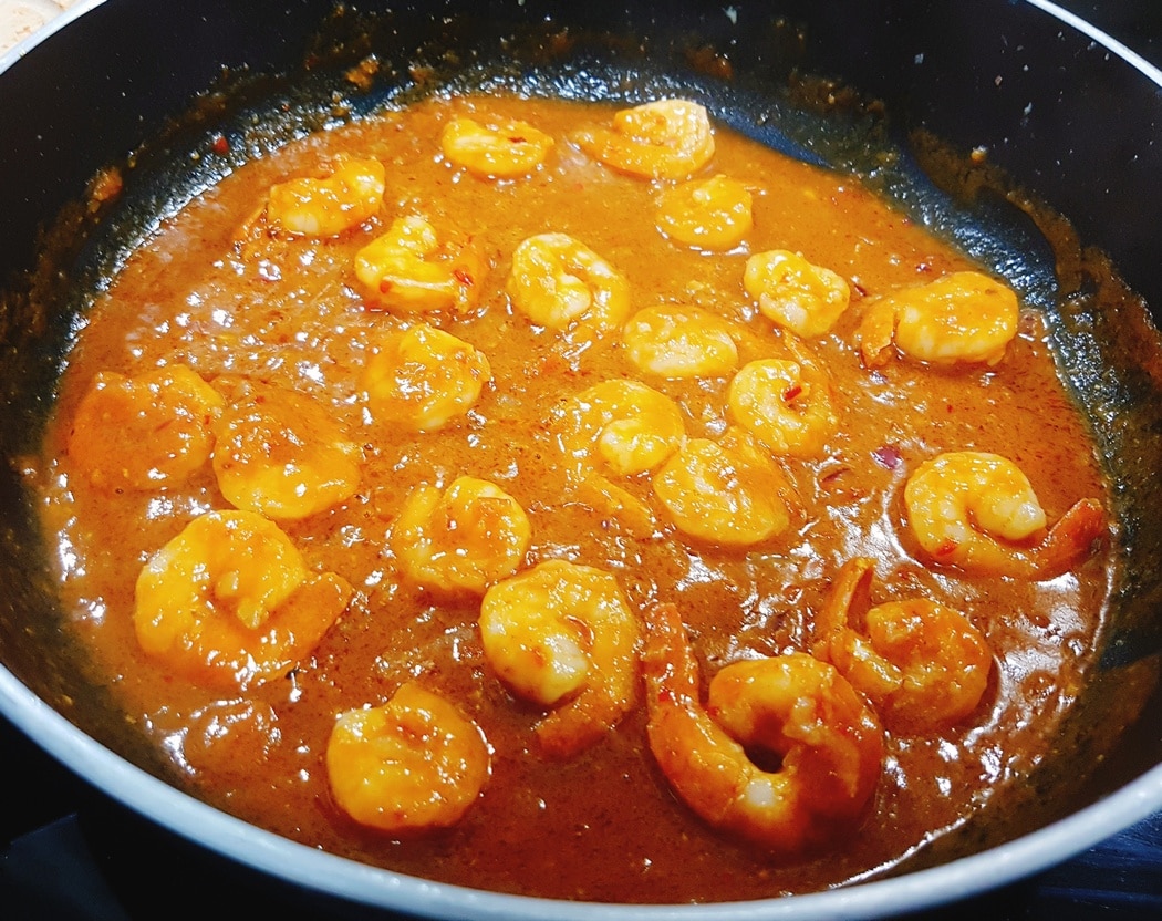 W czasie, gdy krewetki się smażą przygotowujemy sos. Do pasty z tamaryndu dodajemy łyżeczkę pasty chilli (można zamienić na świeże chilli), pół łyżeczki pasty z trawy cytrynowej, łyżkę sosu rybnego, łyżeczkę sosu sojowego, łyżeczkę sosu ostrygowego, pół łyżeczki cukru brązowego i łyżkę soku z limonki. Całość mieszamy, a następnie dodajemy 200 ml ciepłej wody. Mieszamy, aby składniki dokładnie się połączyły.