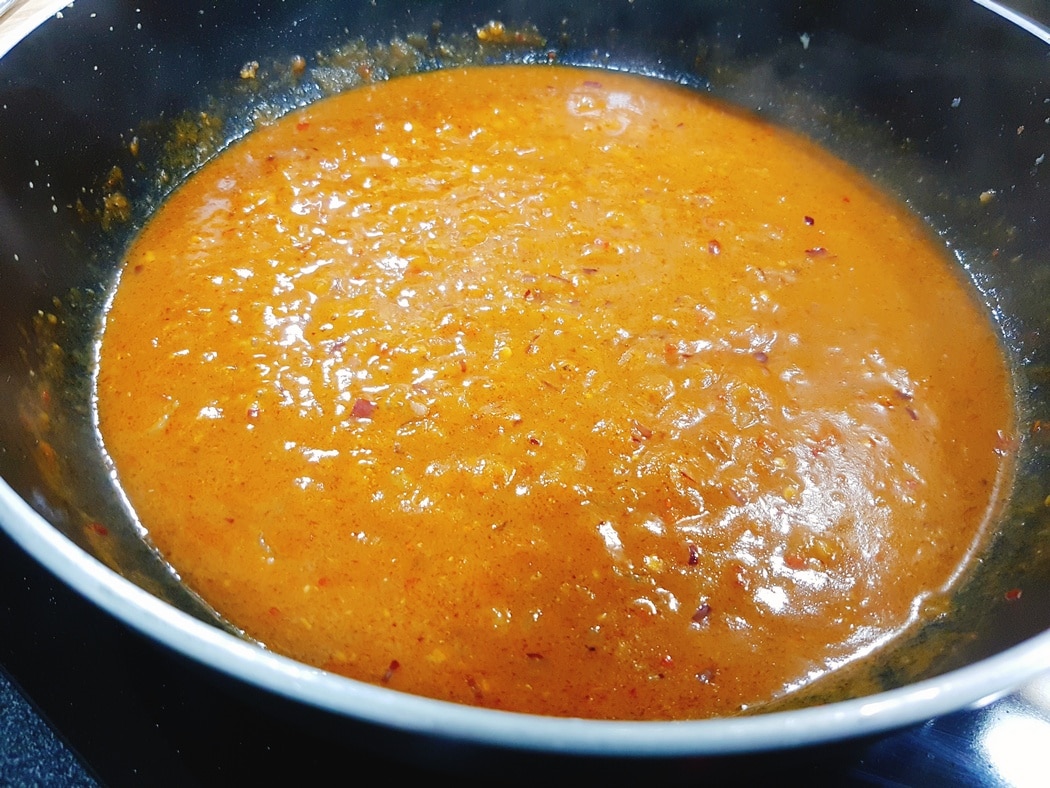 Smażymy, aż cebula się zeszkli następnie dodajemy nasz sos. Cały czas mieszając doprowadzamy go do wrzenia.