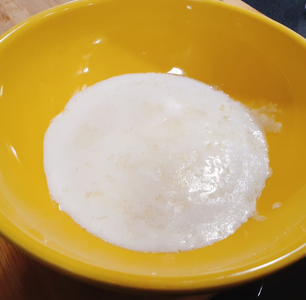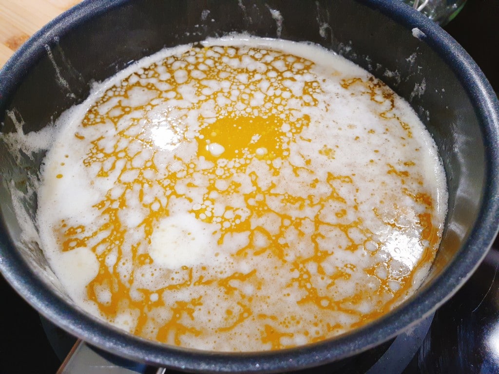 Gdy masło się rozpuści pozostawiamy je na wolnym ogniu. Powoli na powierzchni masła będzie się zbierać biała piana – kazeina. Pianę usuwamy z powierzchni za pomocą łyżki.