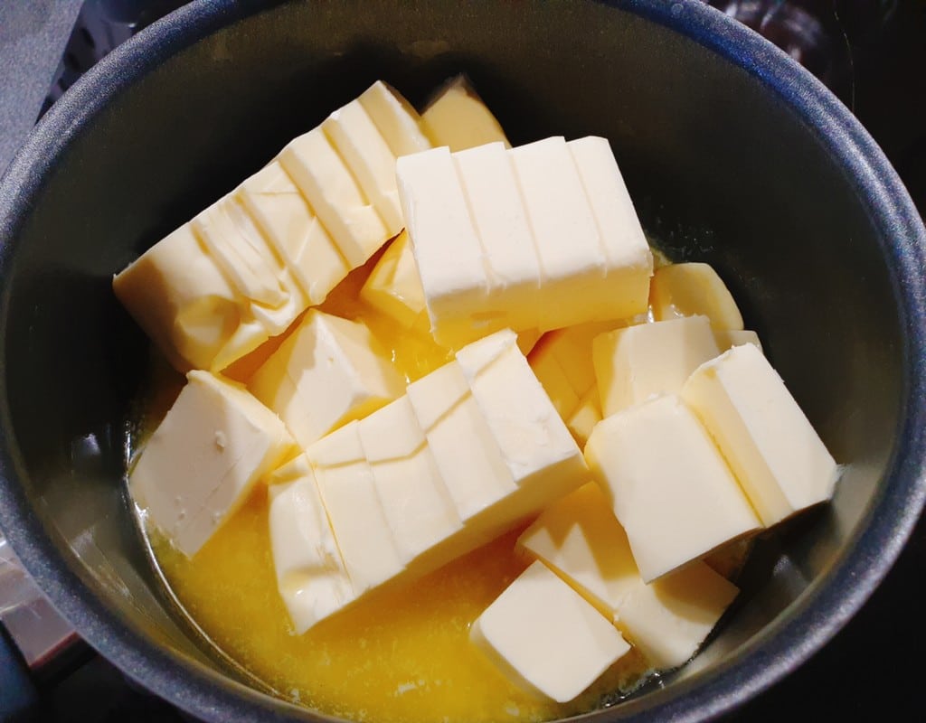 Każdą z kostek masła kroimy na mniejsze kawałki. Następnie przekładamy do rondelka i na bardzo małym ogniu doprowadzamy do rozpuszczenia masła. Nie mieszamy masła w trakcie klarowania. Gdy masło się rozpuści pozostawiamy je na wolnym ogniu.