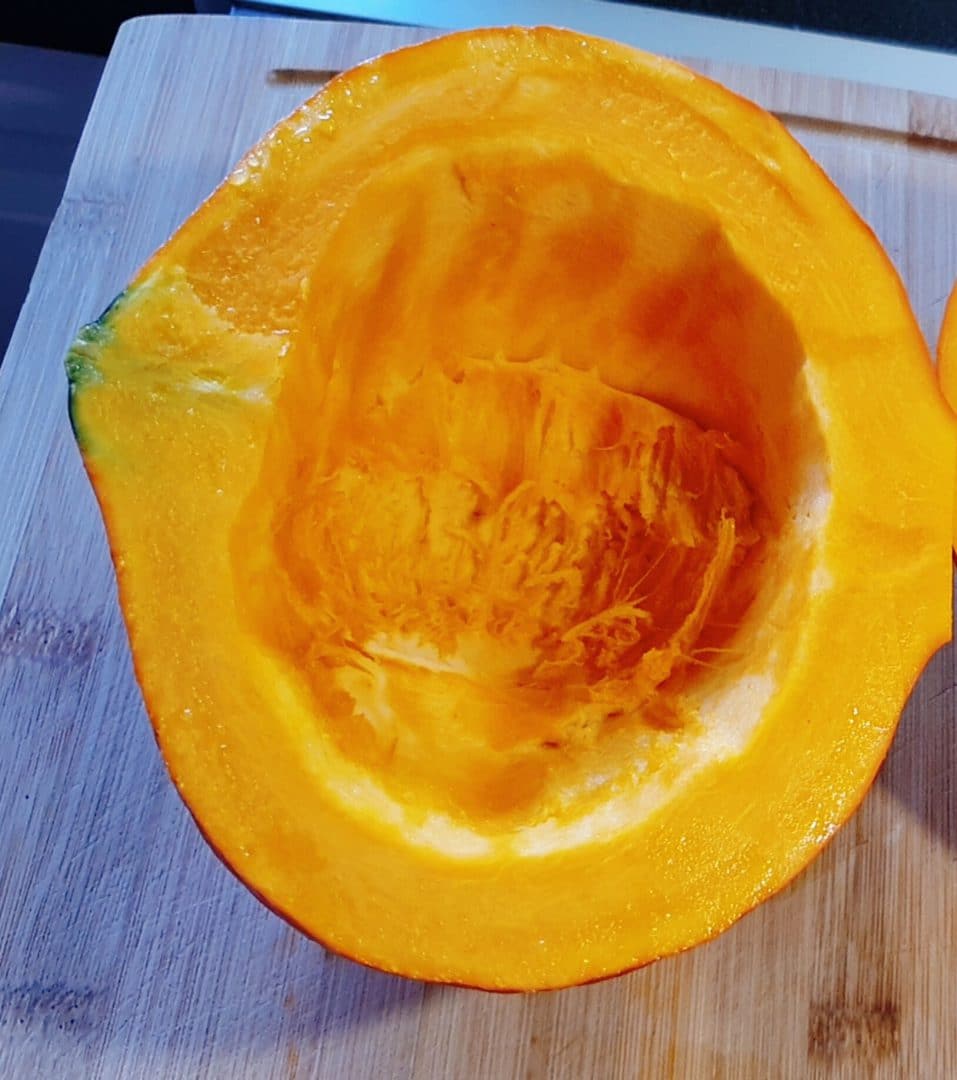 Dynię myjemy i kroimy na pół, a następnie pozbawiamy pestek. Oczyszczone z włókien pestki możemy rozłożyć na papierze i wysuszyć – będą doskonałym dodatkiem do zup lub sałatek.