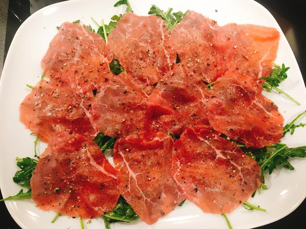 For carpaccio, it’s best to buy a piece of beef tenderloin and put it in the freezer two hours before cutting. It will then cut better. If it’s too cold, thaw it gently before cutting, but not completely. Cut the sirloin into very thin slices for carpaccio. We can also buy ready-made, cut slices of carpaccio.